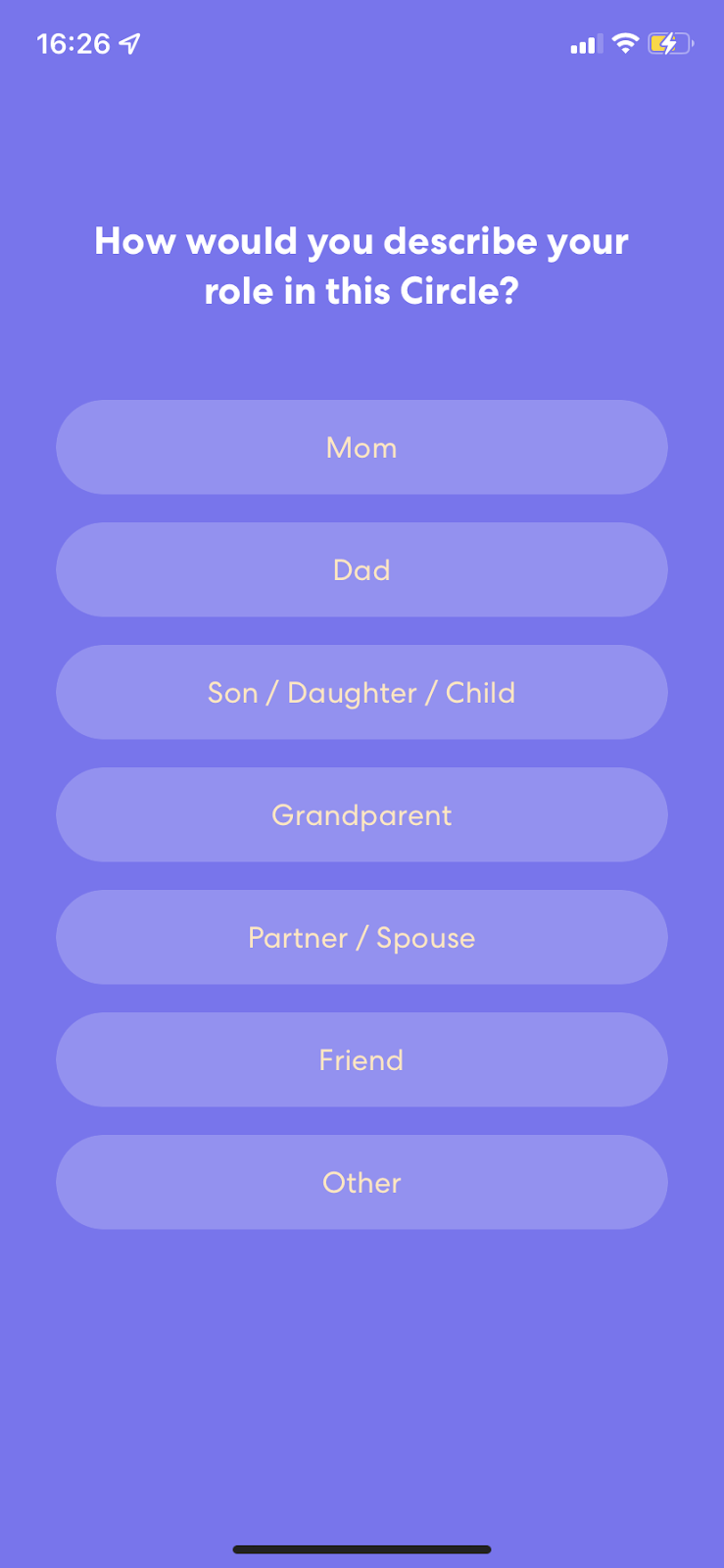 Life360 walks users through a set of questions and settings in the signup process. Although there is no progress indicator, the process is full of tips and copy to reassure the users while also having an aesthetically pleasing color scheme and design.